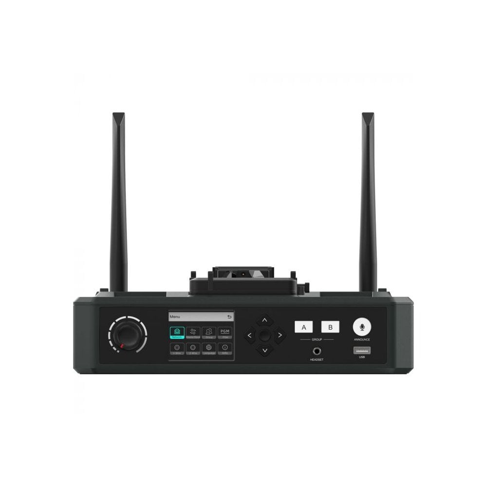 1.9Ghz Dect 6 based duplex wireless comms system, with 6 headsets, spare batteries 8 way charger and case.