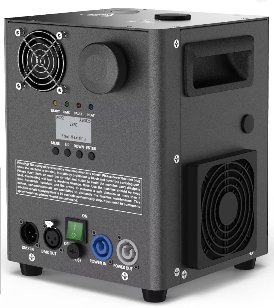 A cost-effective cold spark machine that produces safe, smokeless “cold” sparks by heating composite titanium powder to approximately 550°C, creating vertical fountains that are cool to the touch